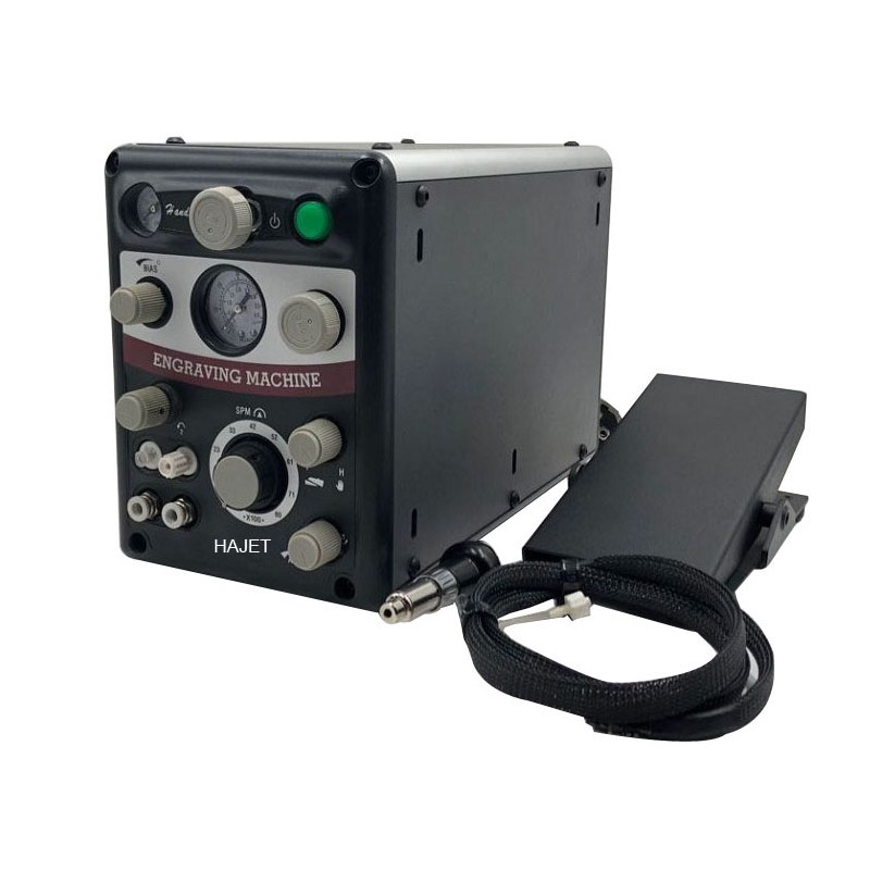 The new Engraving Machine A T type is wonderfully familiar to anyone who uses its predecessors such as the Graver machines, SC type, etc. With the expanded capability of precise, selectable hand control, this new power tool is in a class by itself. The hand control technology is based on the HAJET Airtact. This advanced air logic system provides hand power control without adding moving parts to the handpiece itself. The result is a rugged and intuitive way to control handpiece power by hand. When foot control is preferred, it is only seconds away. Just one simple selector knob instantly provides greater control, choice, and refinement while working. The ability to instantly change from hand to foot control, as desired, means new creative freedom and reduced stress.